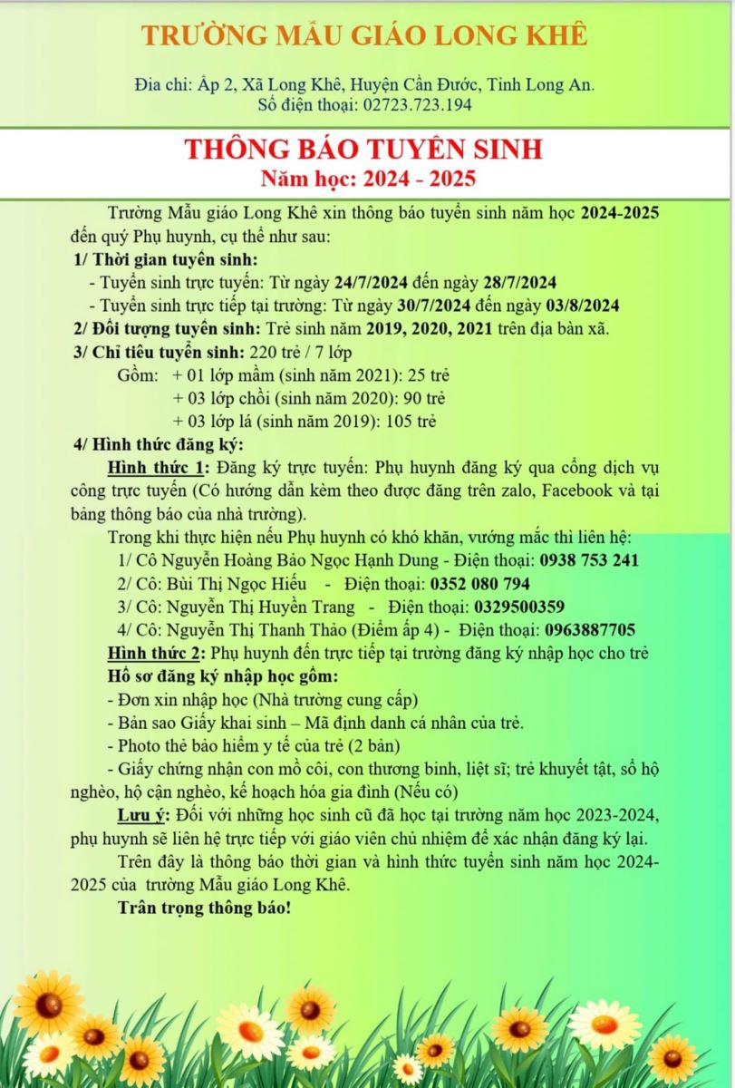 • Trường Mẫu Giáo Long Khê thông báo tuyển sinh năm học 2023-2024.