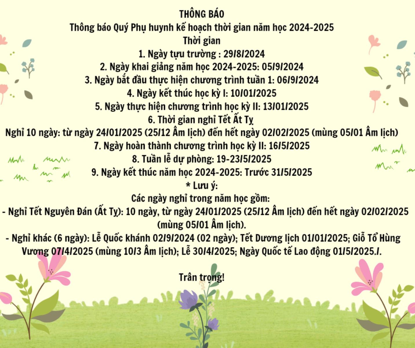 TRƯỜNG MẪU GIÁO LONG KHÊ THÔNG BÁO LỊCH NGHỈ TẾT DƯƠNG LỊCH